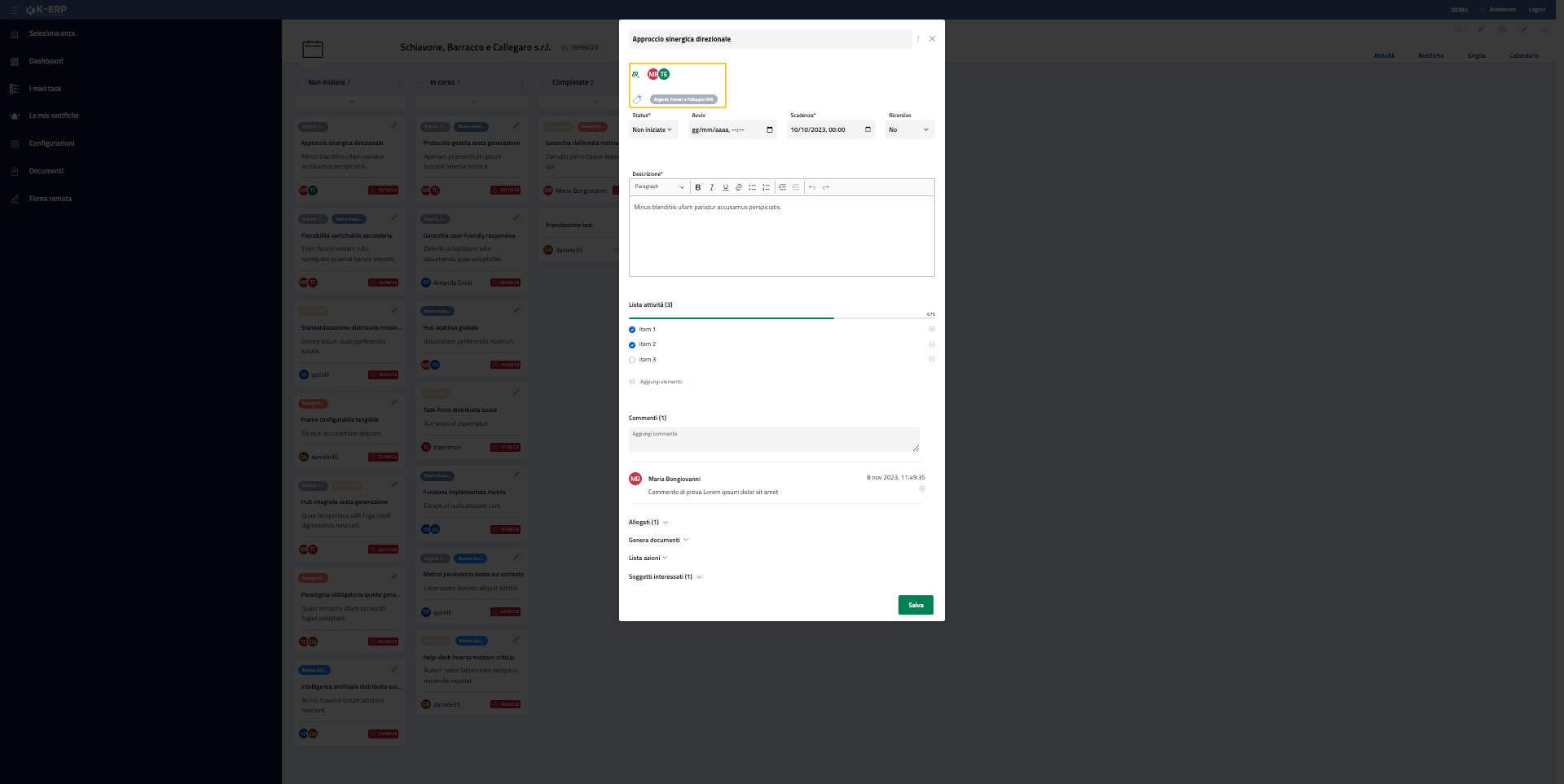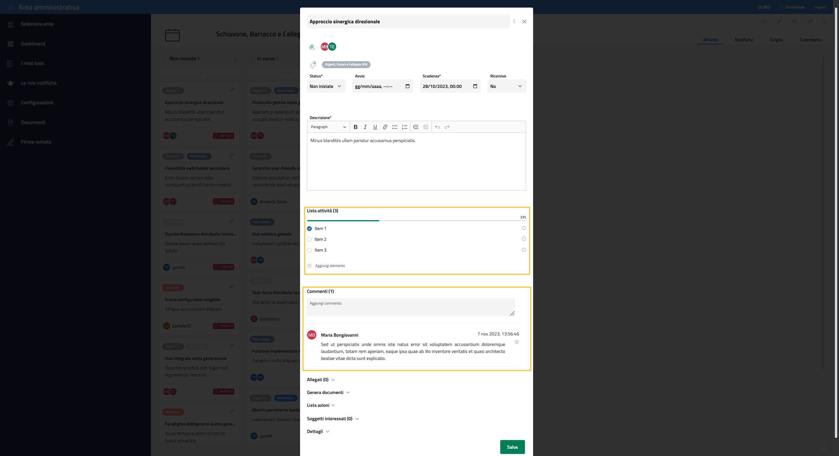 È possibile, inoltre, per tutti gli utenti conivolti nel task aggiungere dei commenti. Per aggiungere un commento è sufficiente scrivere all’interno del box “Aggiungi commento” e premere il tasto INVIO una volta terminato.