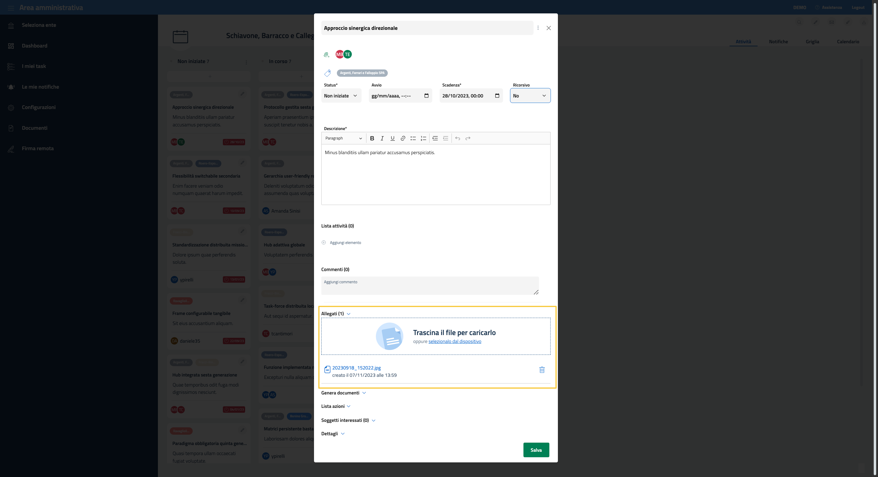 Per visualizzare e associare degli allegati al task è sufficiente cliccare la freccia che punta in basso posta accanto. Nell’area che si espanderà sarà disponibile la lista degli allegati già associati al task e un riquadro che ne permette il caricamento di nuovi.