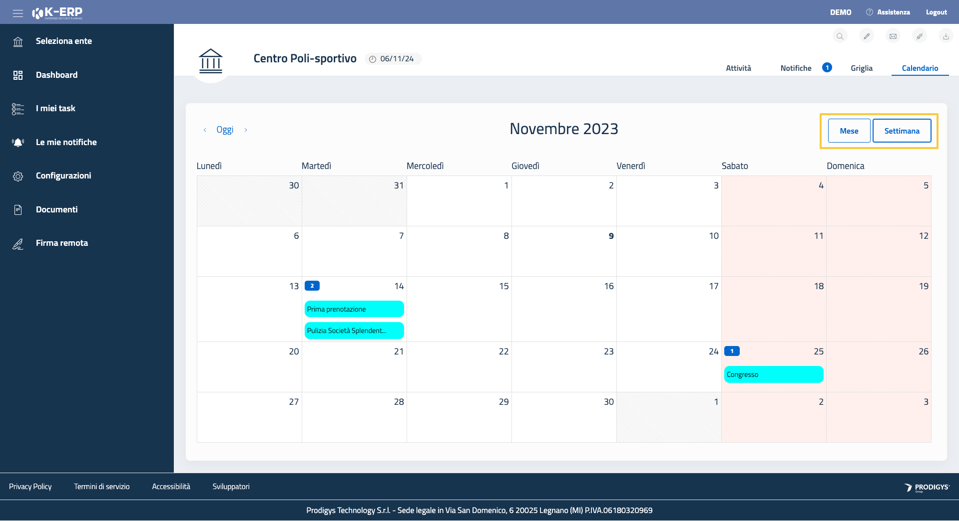 Il Calendario è disponibile in due diverse viste: mese e settimana. Permette di vedere su calendario le scadenze dei singoli task