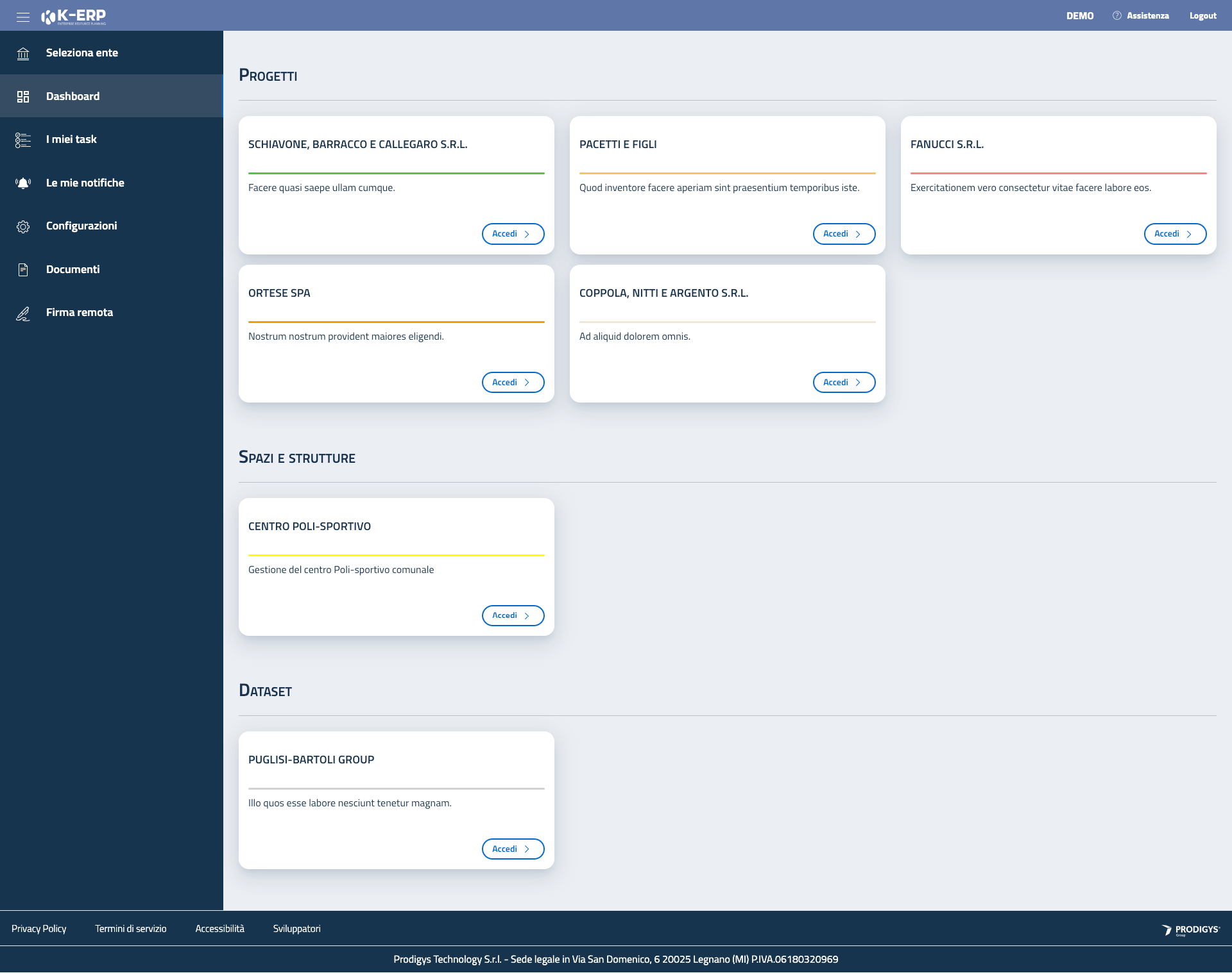 La prima schermata dopo la scelta dell’ente è quella della Dashboard. La dashboard è il pannello di controllo di tutti i progetti, dataset e strutture che l’ente dovrà gestire.