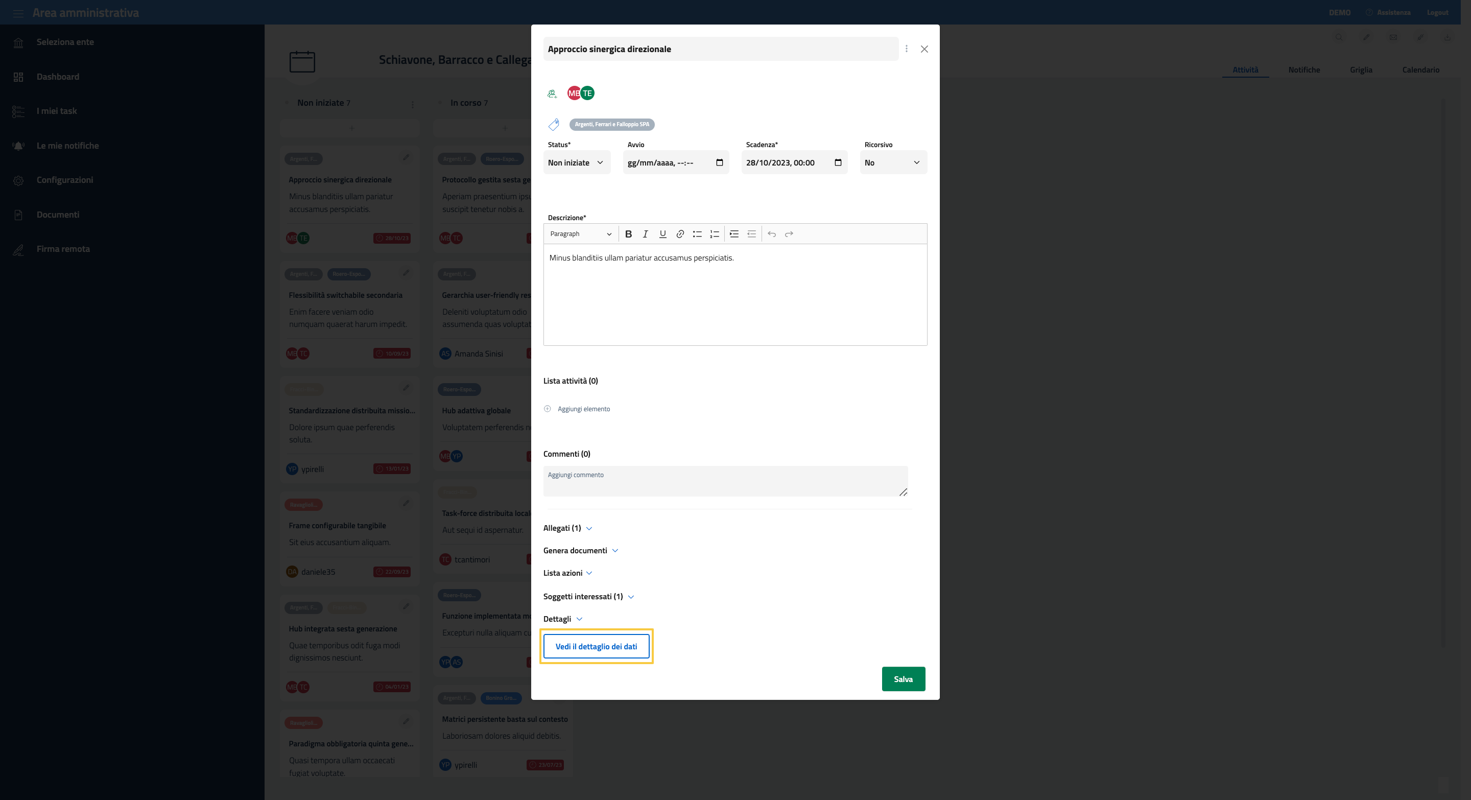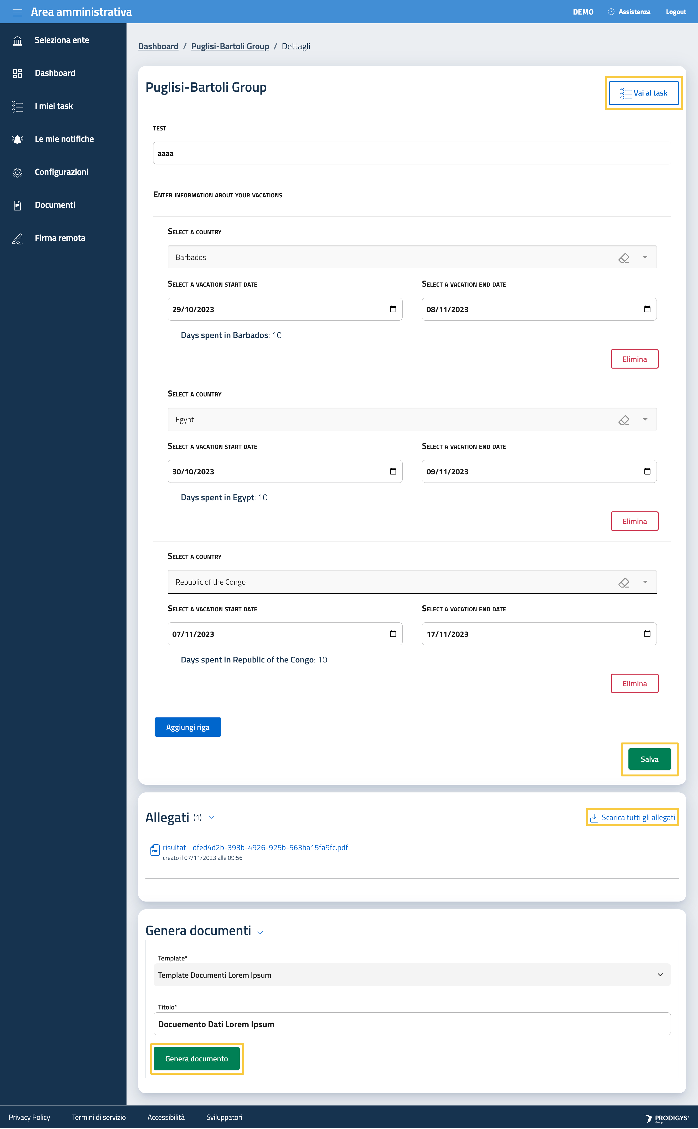 Inoltre, è disponibile la lista degli allegati associati e la possibilità di generare un documento a partire dai dati in dettaglio seguendo un template prestabilito e scelto da una lista di template disponibili.
