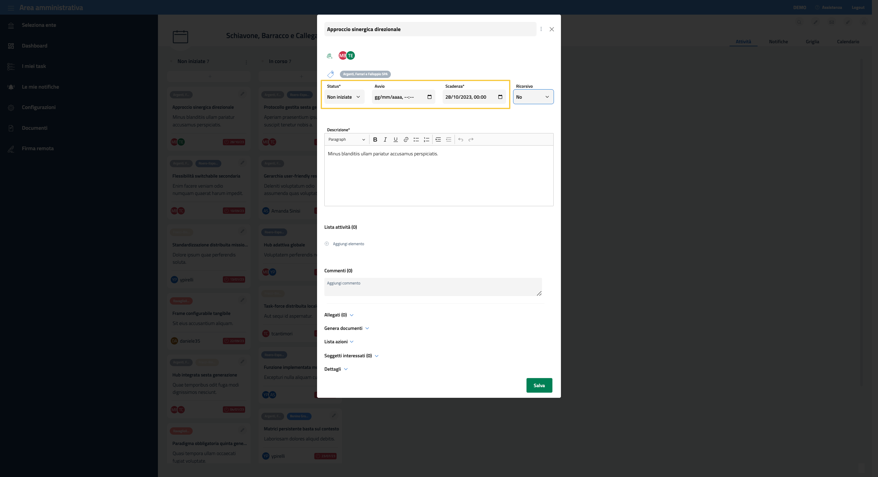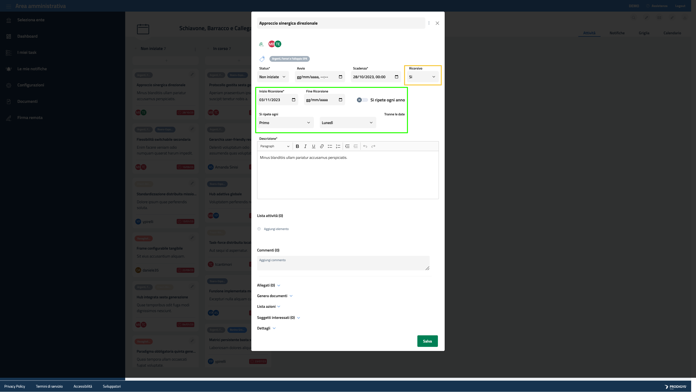 Immediatamente sotto sono presenti dei box che permettono di definire le date di inzio e scadenza dell’attivtà, lo status e l’eventuale ricorsione.