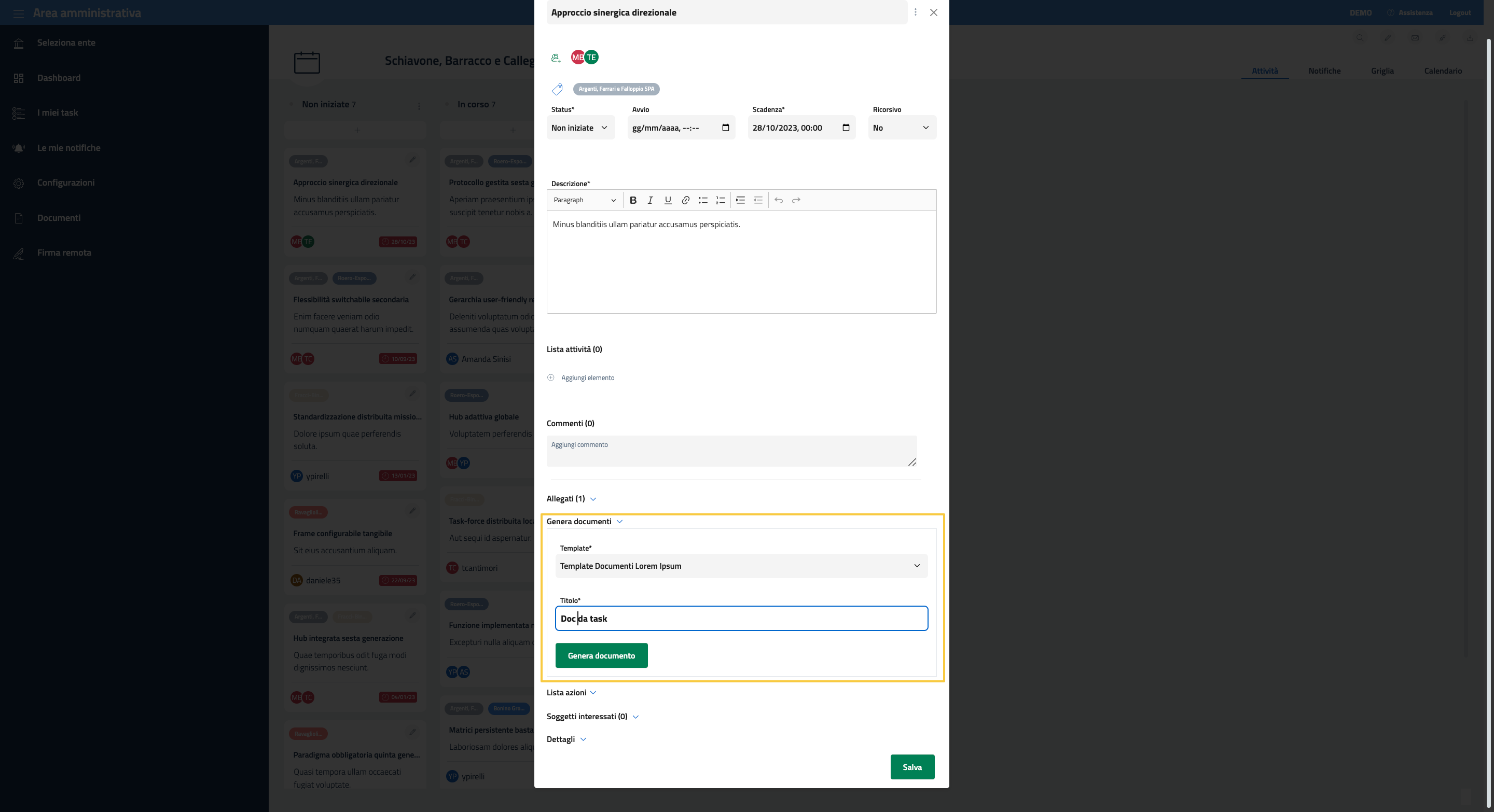 Questa area permette di generare in automatico un documento con i dati presenti nel task secondo un template prestabilito e scelto dalla lista dei template disponibili cliccando sull’appostio box “Seleziona template”.