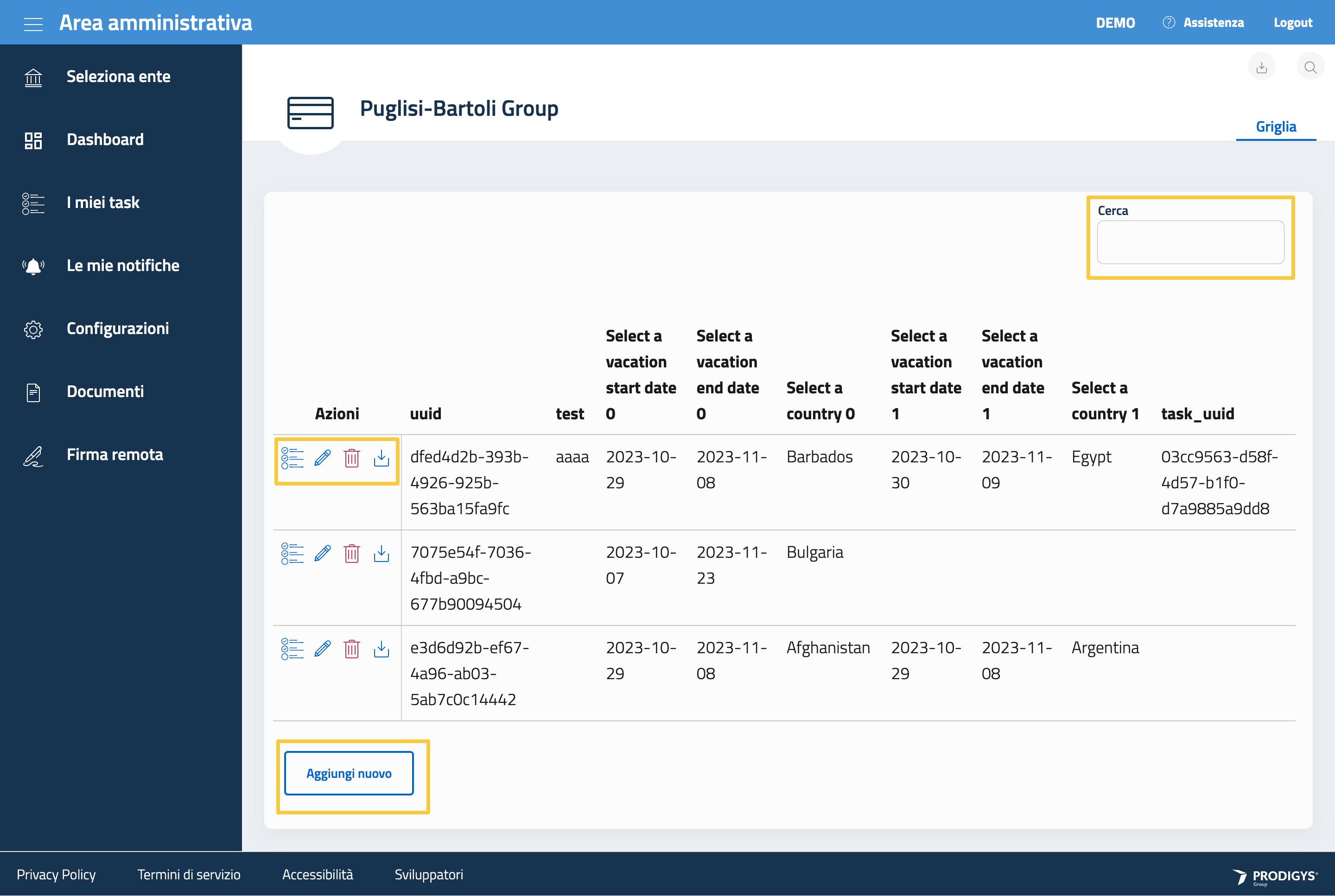 L’icona della freccia in basso permette di effettuare il download dei dati registrati nella riga.