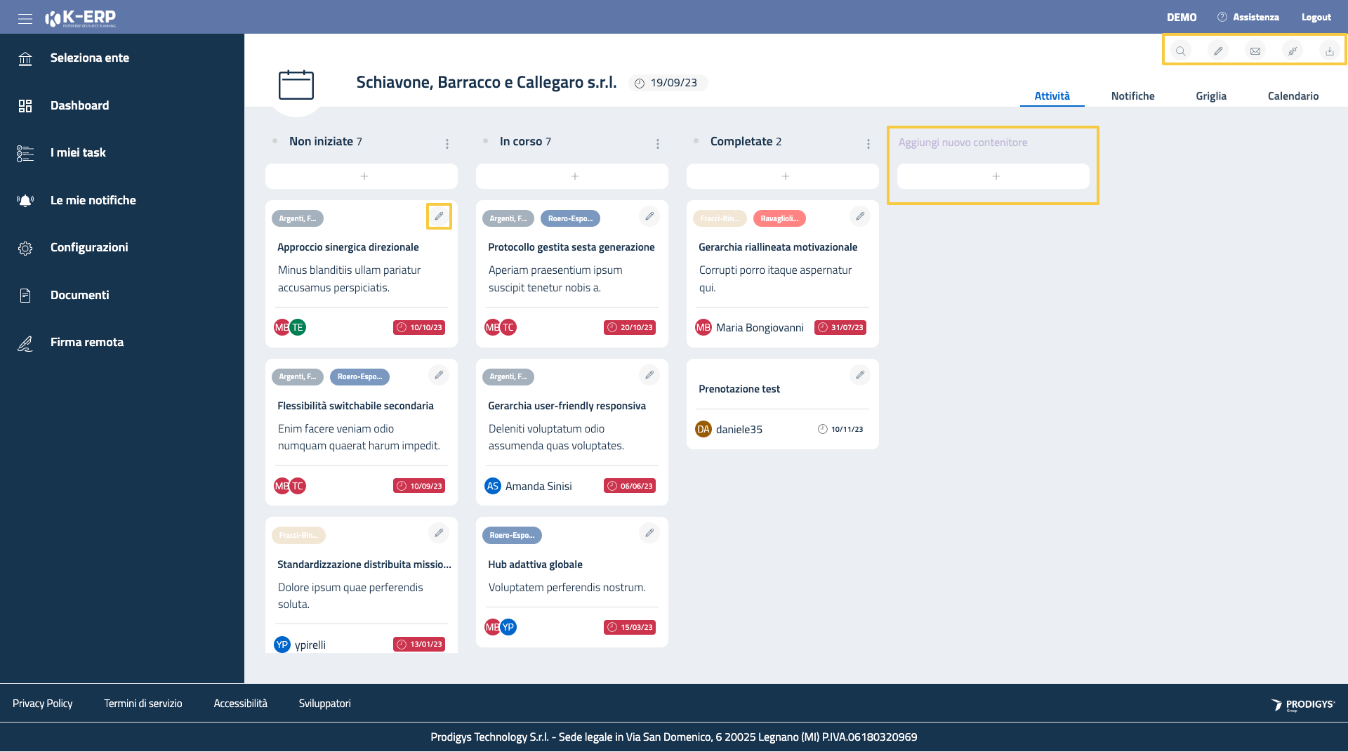 La sezione Attività è il cuore del progetto. Permette di monitorare e gestire il flusso di lavoro tramite la suddivisione delle attività in “Contenitori”. Ogni contenitore rappresentata lo “status” di una attività che evolve nel tempo.