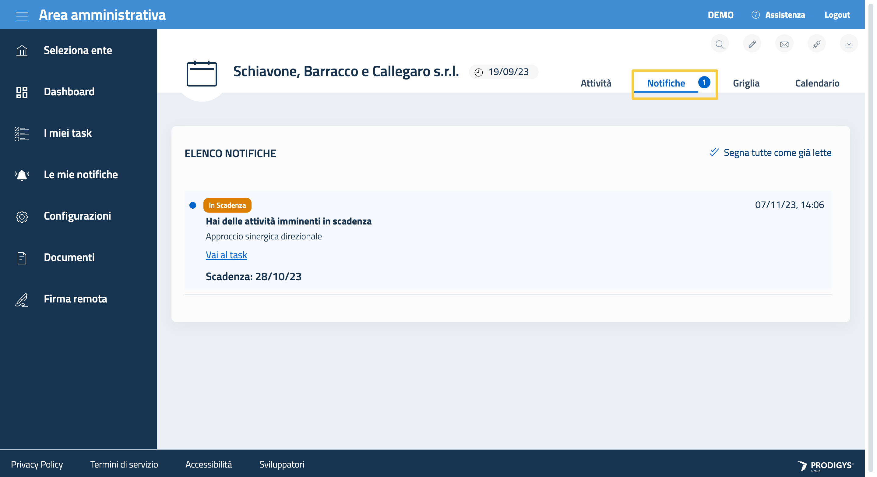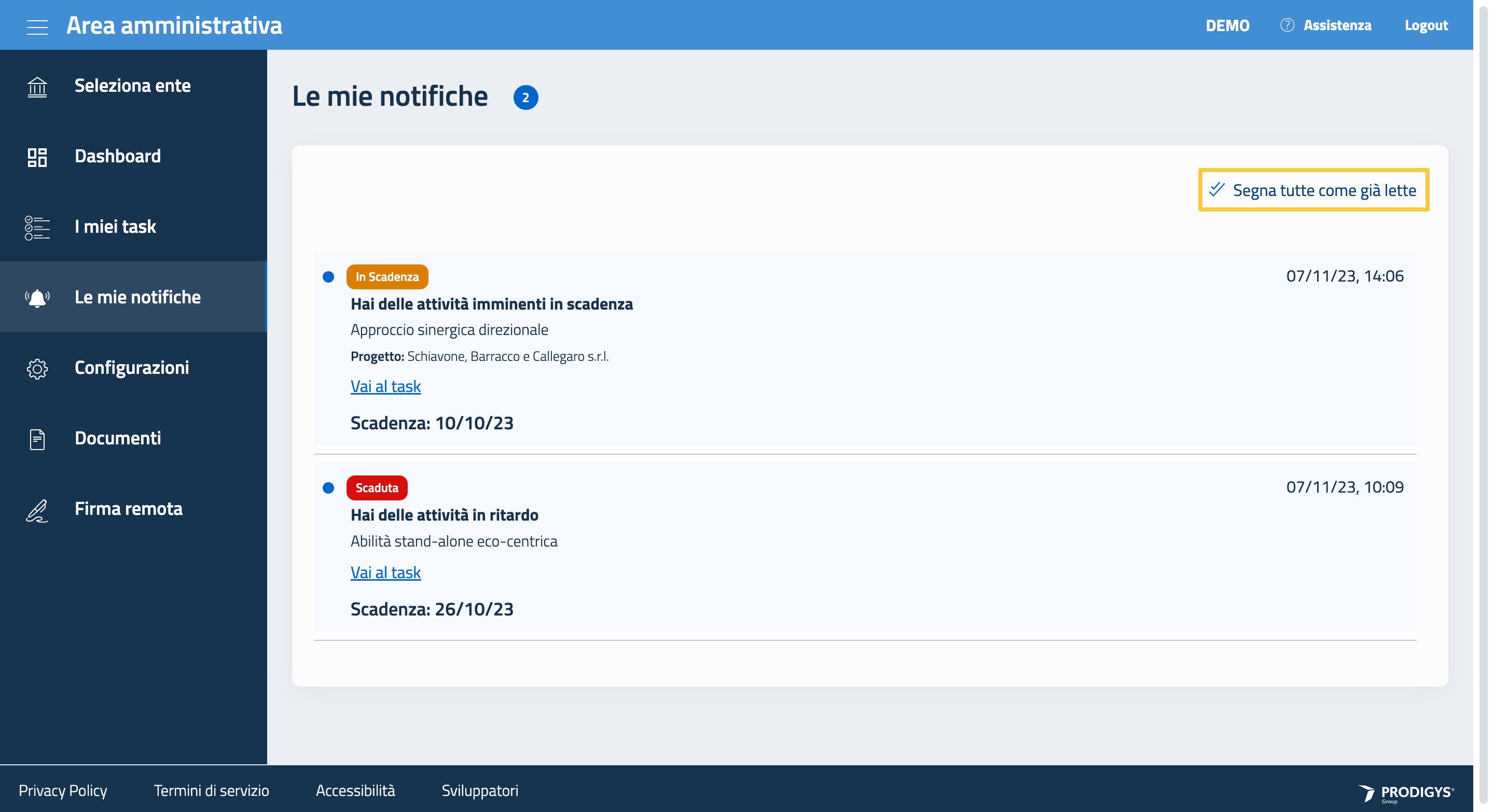 La sezione Le mie notifiche è raggiungibile direttamente dal menu laterale.