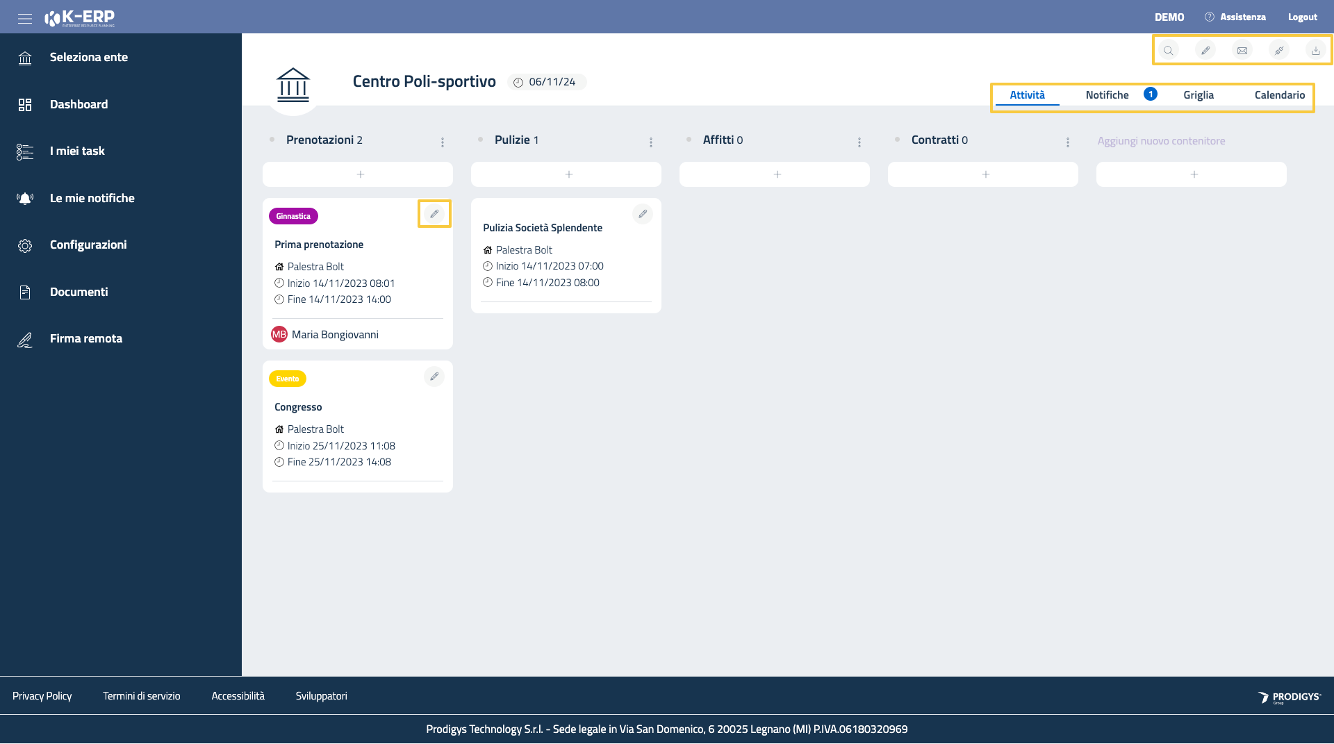 La sezione attività permette di organizzare la gestione di spazi/aree/strutture grazie alla visualizzazione a bacheca dinamica. Ogni elemento è configurabile cliccando sul simbolo della matita posto all’angolo in alto a destra di ognuno di essi.
