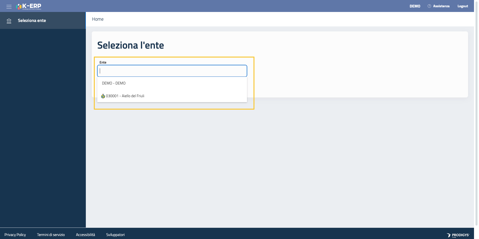 Al login il sistema permette di selezionare l’ente dal campo di auto-completamento «Cerca ente». L’elenco degli enti disponibili fa riferimento agli enti ai quali si ha accesso.