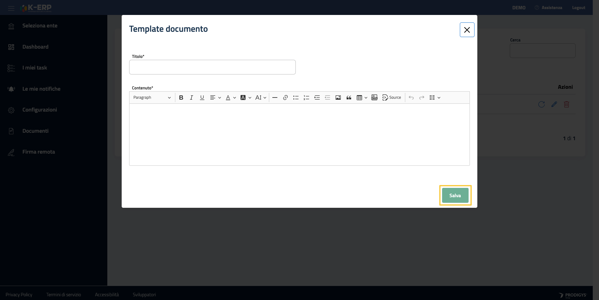 La pagina di configurazione Template Documenti permette di impostare un template secondo il quale poter generare automaticamente dei documenti all’interno della piattaforma.