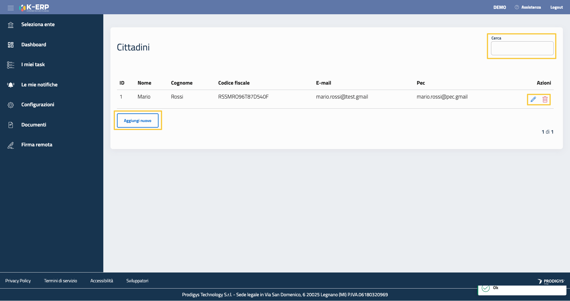 Per aggiungere un nuovo cittadino è sufficiente cliccare sul pulsante in fondo “Aggiungi nuovo”. Al click si aprirà un finestra contenente i campi per la configurazione.