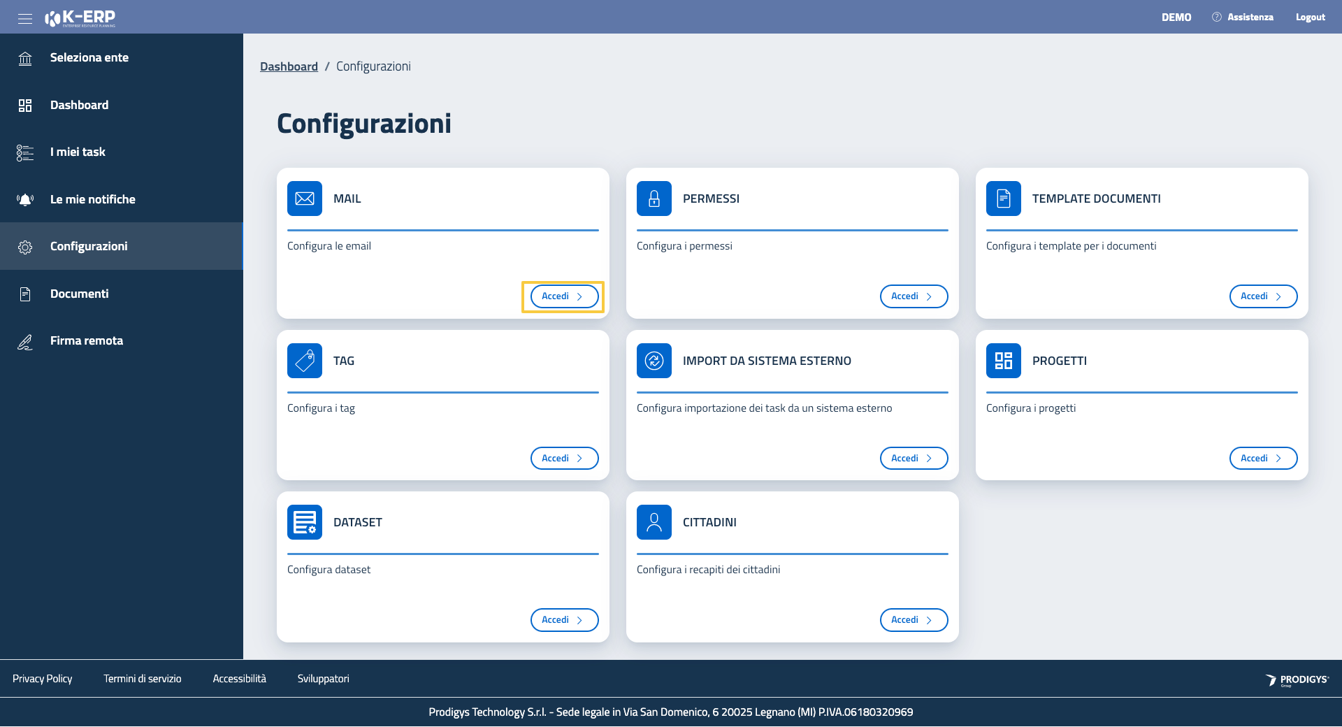 Per accedere alla pagina di configurazione di un elemento è sufficiente cliccare sul tasto “Accedi” corrispondente