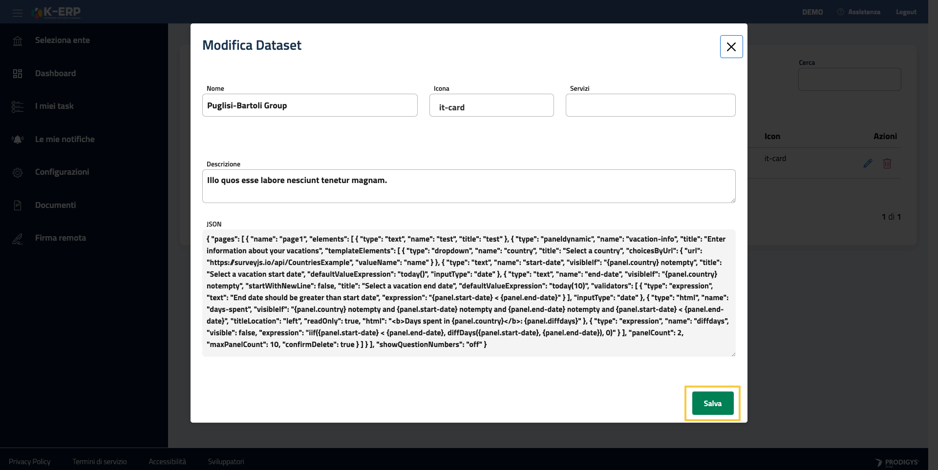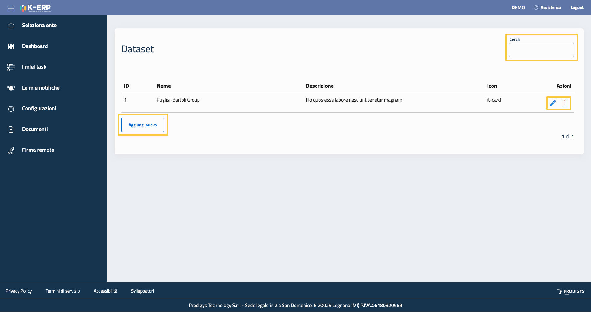 È possibile modificare o eliminare un datset cliccando rispettivamente sul simbolo della matita e il simbolo rosso del cestino.