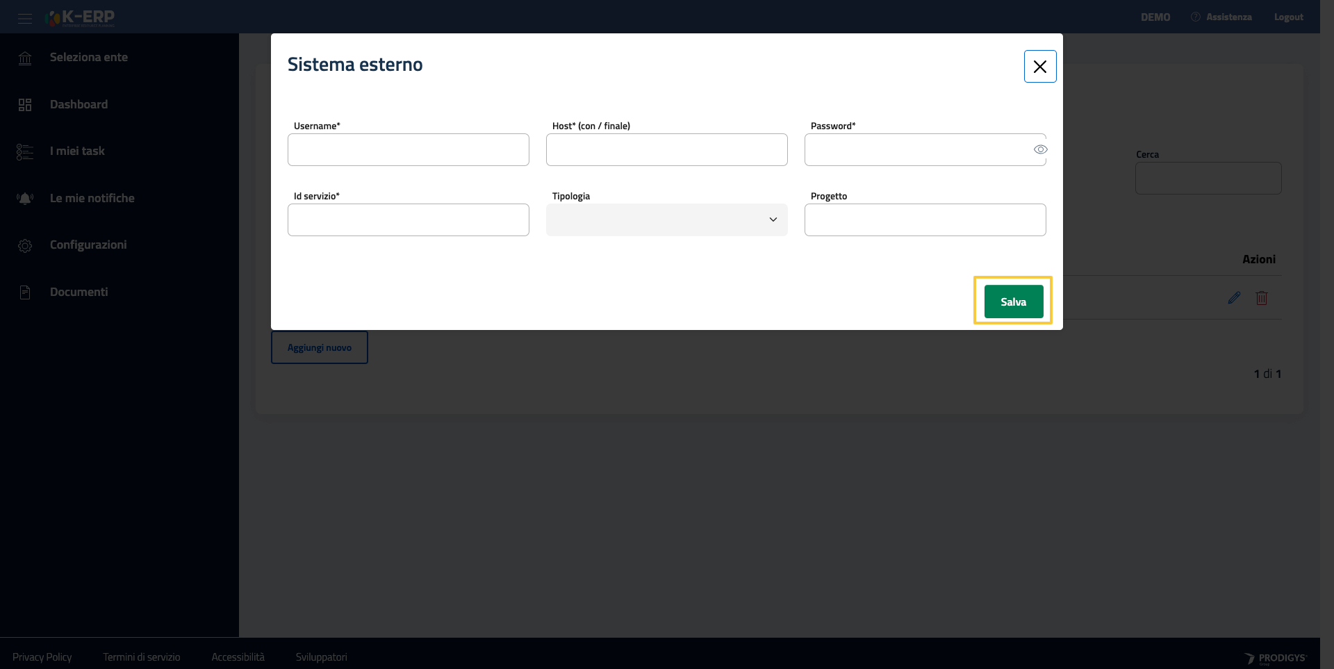 Per aggiungere un nuovo sistema esterno è sufficiente cliccare sul pulsante in fondo “Aggiungi nuovo”. Al click si aprirà un finestra contenente i box per la configurazione.
