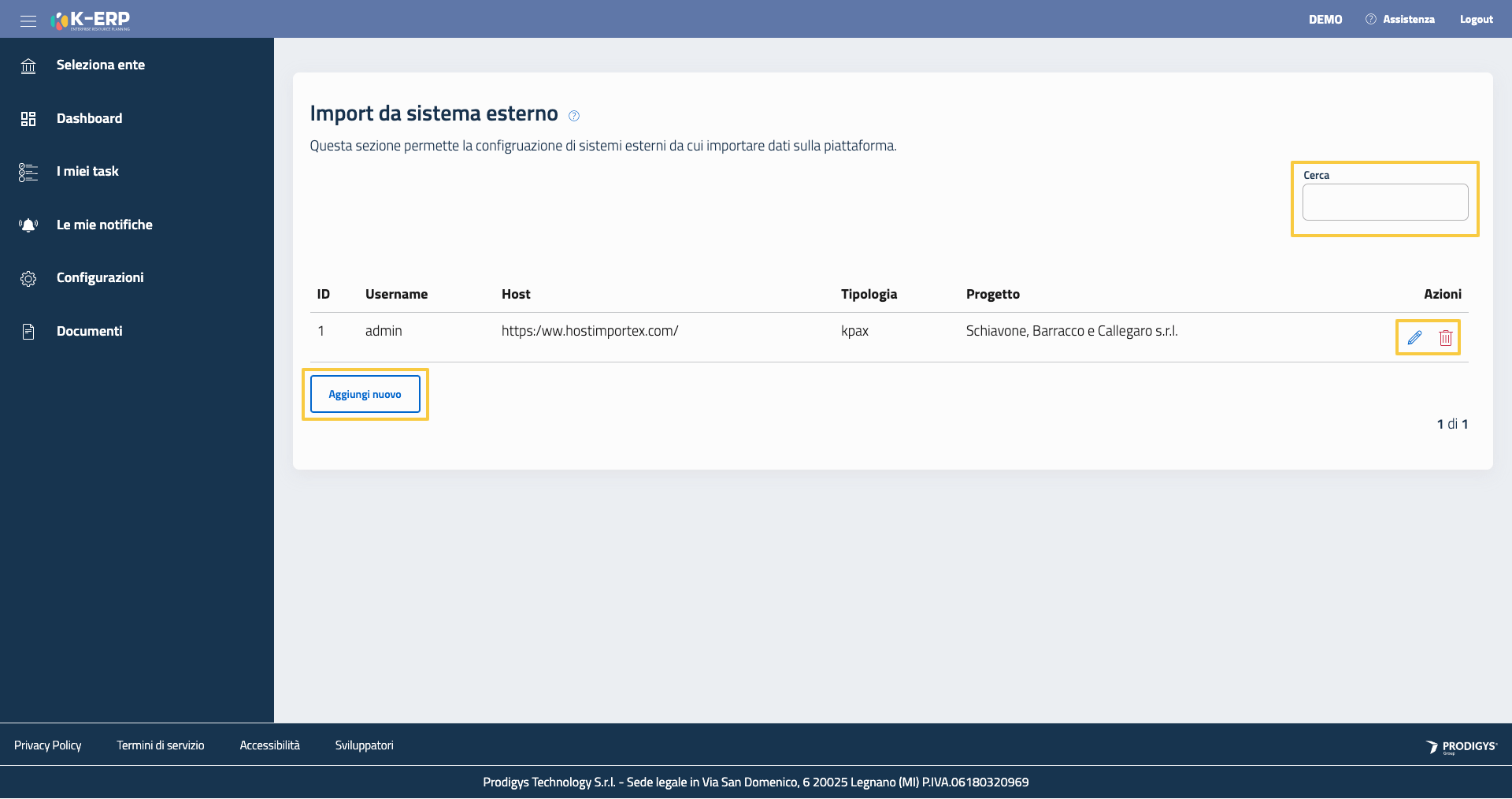 La pagina di configurazione Import da sistema esterno permette di configurare dei sistemi esterna da cui importare dati all’interno della piattaforma.