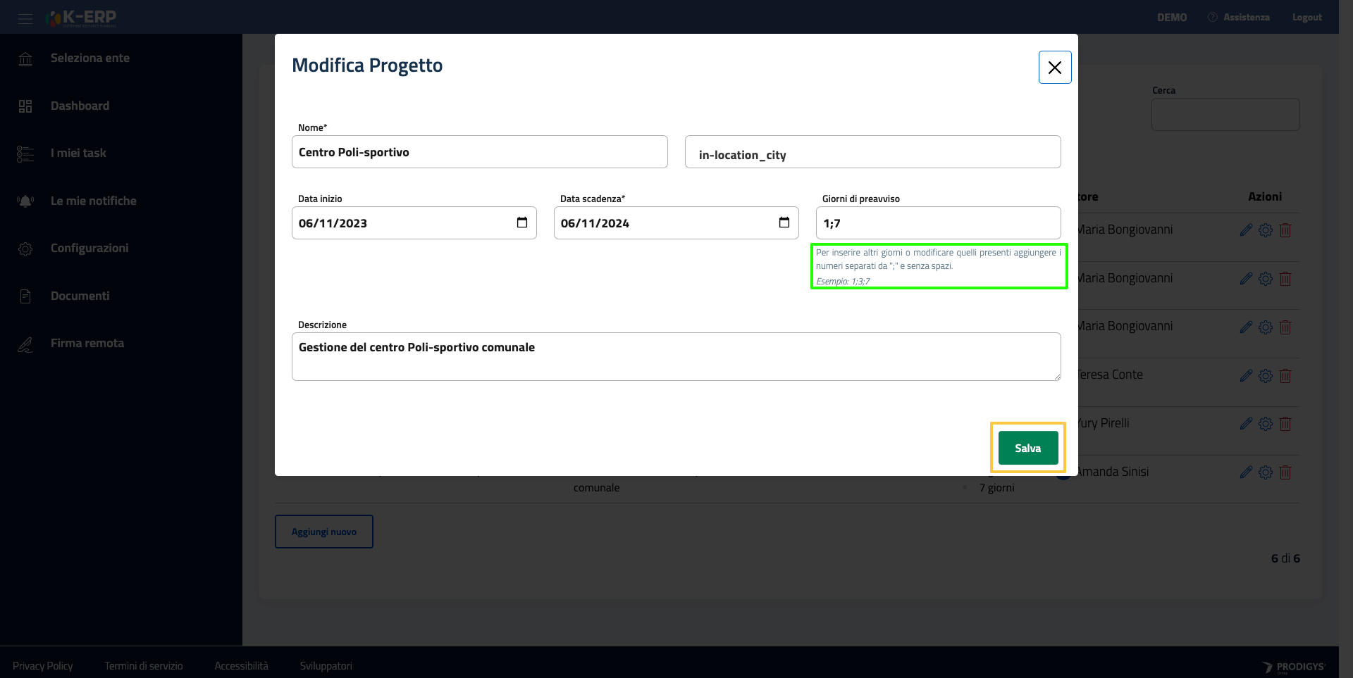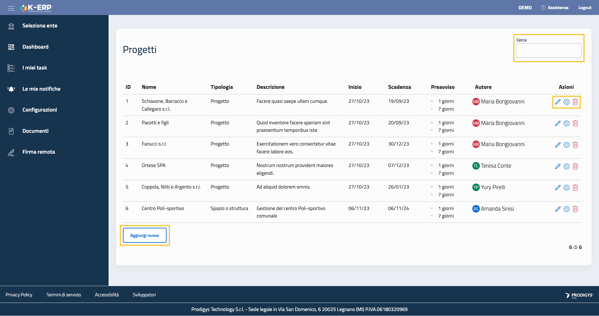 È possibile modificare, associare una struttura o eliminare un progetto cliccando rispettivamente sul simbolo della matita, il simbolo della rotellina e il simbolo rosso del cestino.