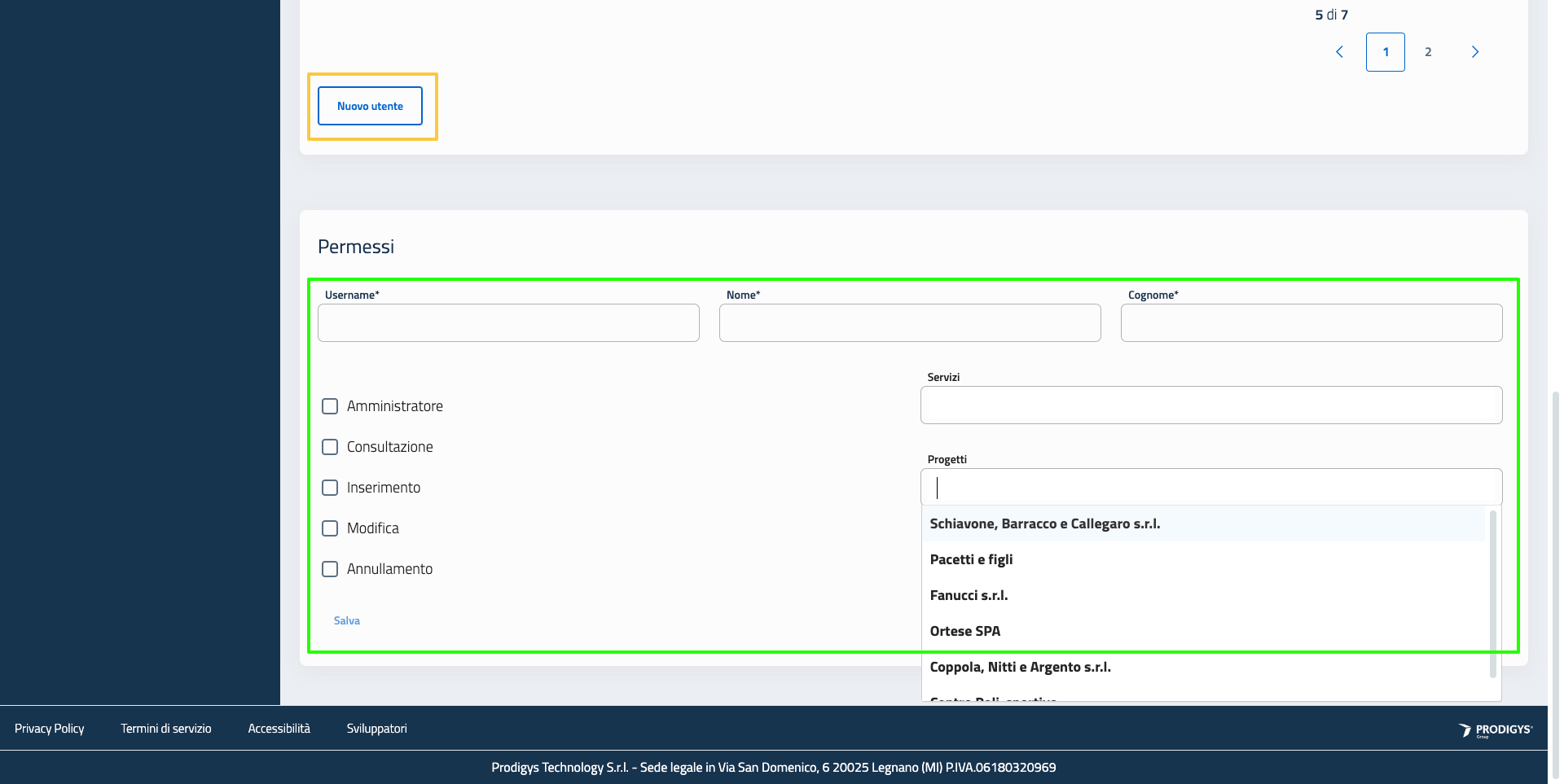 La pagina di configurazione Permessi permette di gestire i permessi degli utenti della piattaforma.